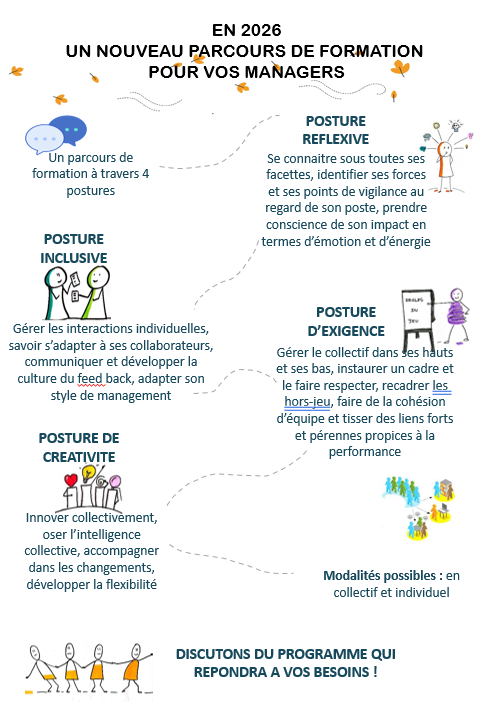 Développer des postures de management, s’interroger sur ses pratiques, ancrer de nouveaux comportements managériaux pour aider vos responsables à atteindre leurs objectifs. Les former dans leurs pratiques de tous les jours parce qu’ils communiquent avec leurs équipes, parce qu’ils doivent veiller à la cohésion d’équipe, parce qu’ils managent des situations complexes qui nécessitent formation et soutien et enfin parce que nous leur devons un accompagnement dans le développement de leurs compétences relationnelles et comportementales si précieuses avec la venue des nouvelles générations. Ils sont la clé de voute de la performance de vos collectifs de travail : Formons les !